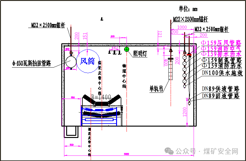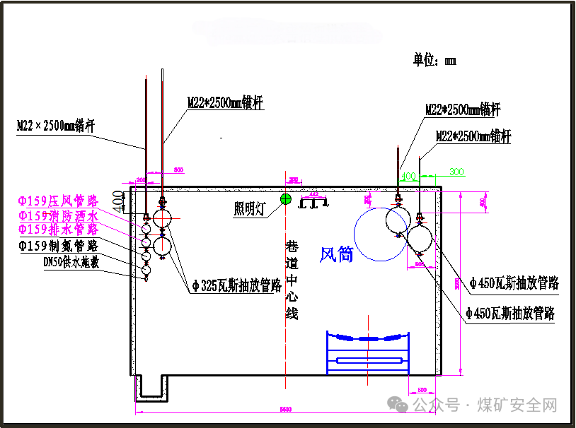 (1)在巷道掘进期间正帮侧安装一趟φ450PE管采前预抽瓦斯,后续安装一趟高位裂隙和两趟上隅角瓦斯抽放管路,具体吊挂尺寸见图纸。