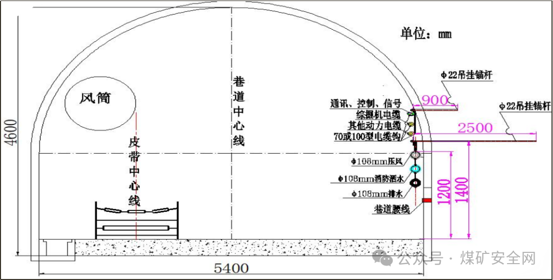 1.巷道内管路共计3趟,布置在皮带机里侧(一般情况下),从上自下分别为φ108压风、φ108消防洒水及φ108排水管路。